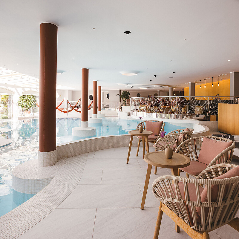 Ganz oben im Adults Only-Bereich, dem VistaSpa, befindet sich das Panorama-Infinity-Solebecken (34 °C). Im warmen, sanft pflegenden Wasser schwebend, mit Rundumblick auf Berge und Talkessel, scheint die Zeit stillzustehen.