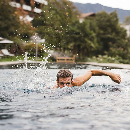 Direkt im Hohenwart Garten, umgeben von üppigem Grün und verwöhnt von vielen Sonnenstrahlen, liegt unser Sportbecken, das immer angenehme 28 °C hat. Es ist der perfekte Ort, um in Bewegung zu kommen.